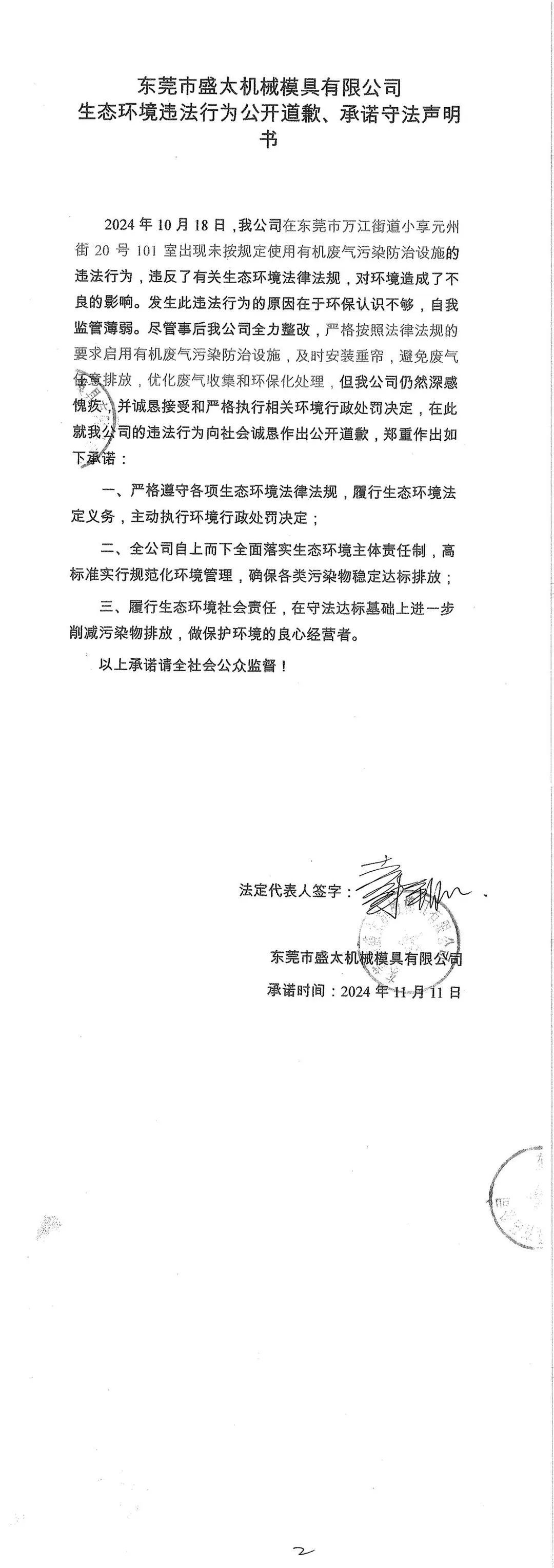 東莞市盛太機械模具有限公司生態環境違法行為公開道歉、承諾守法聲明書
