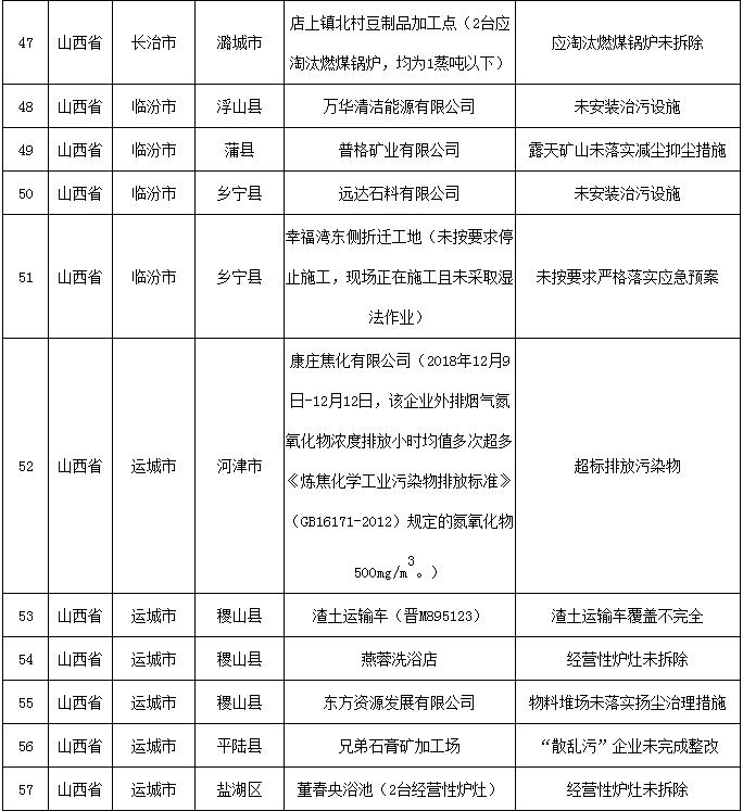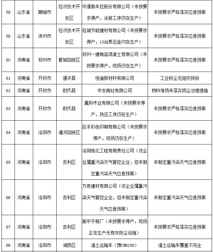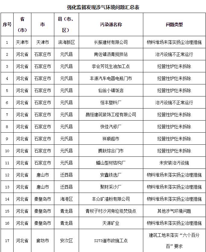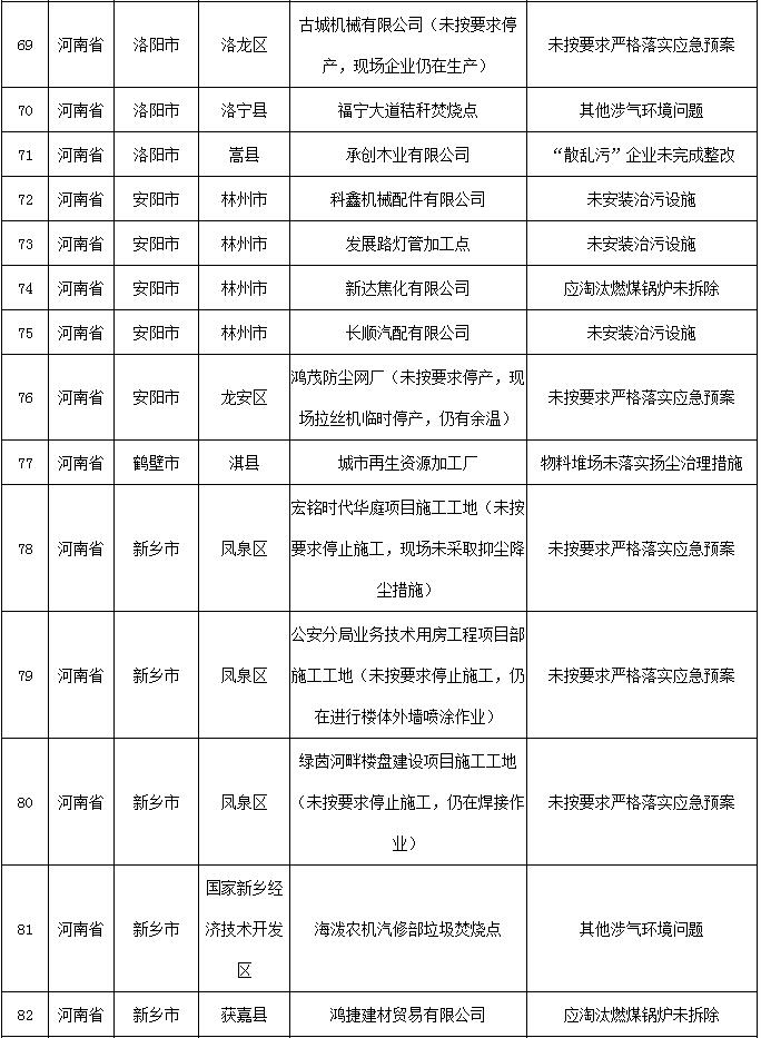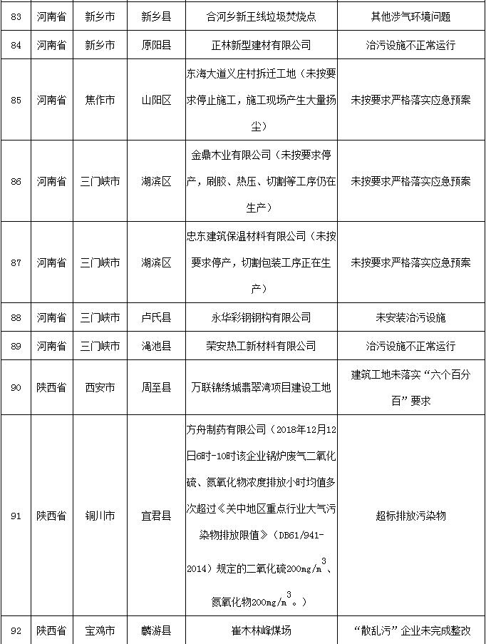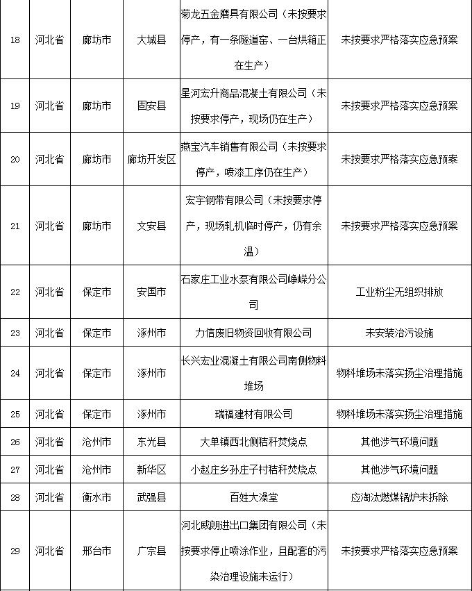 2018-2019年藍天保衛(wèi)戰(zhàn)重點區(qū)域強化監(jiān)督工作繼續(xù)開展,12月13日工作組發(fā)現(xiàn)涉氣環(huán)境問題80個(其中1家企業(yè)有2臺應淘汰燃煤鍋爐,1家企業(yè)有2臺經(jīng)營性爐灶),12月14日工作組發(fā)現(xiàn)未嚴格執(zhí)行重污染天氣應急響應問題23個(見附表)。